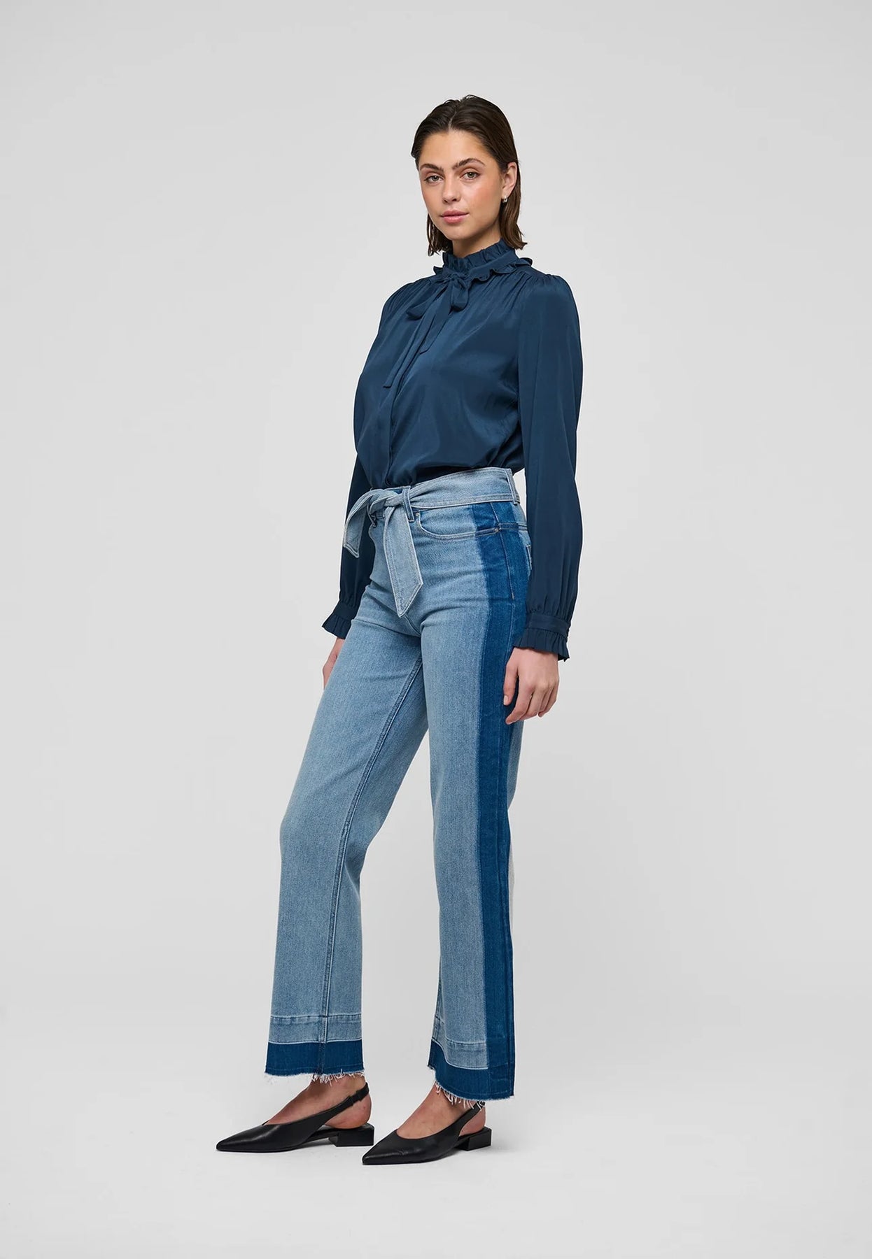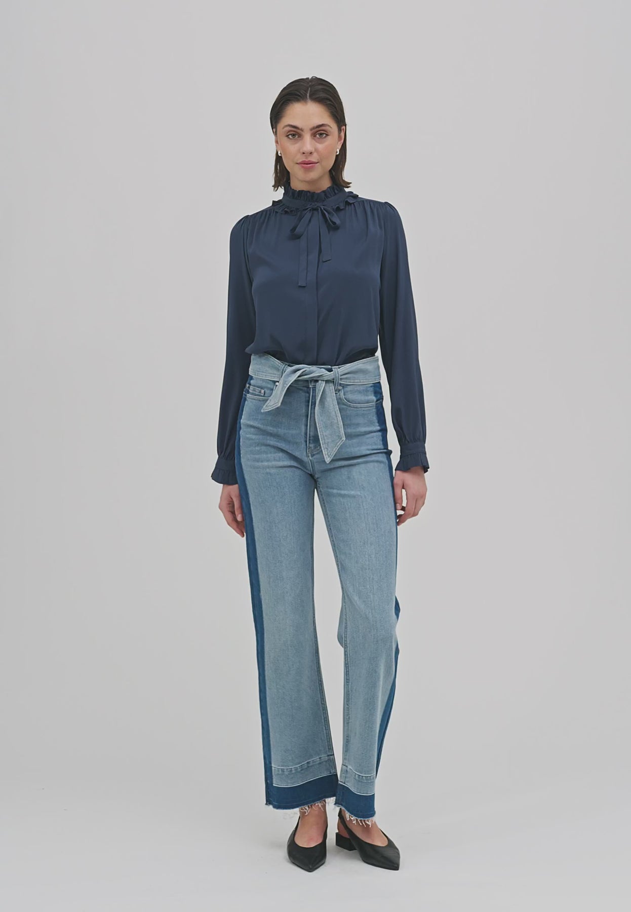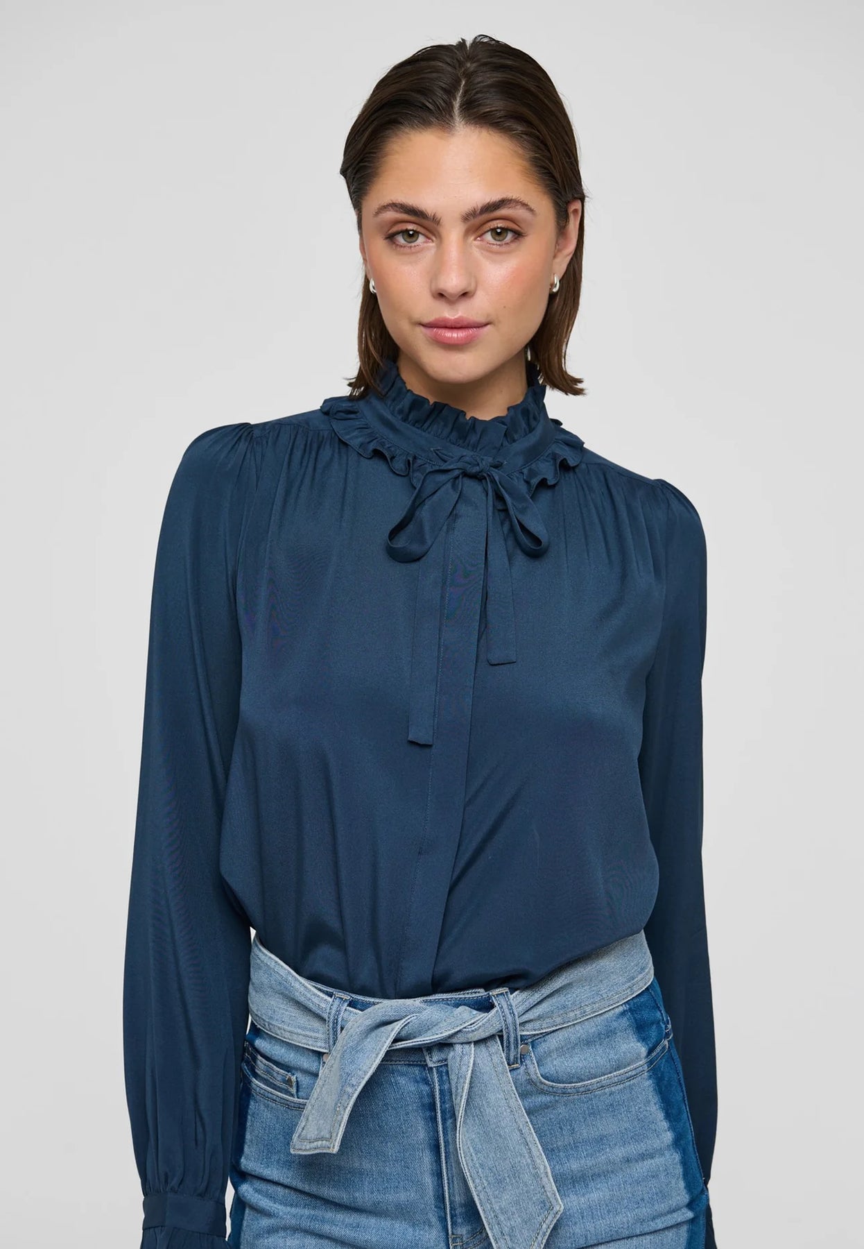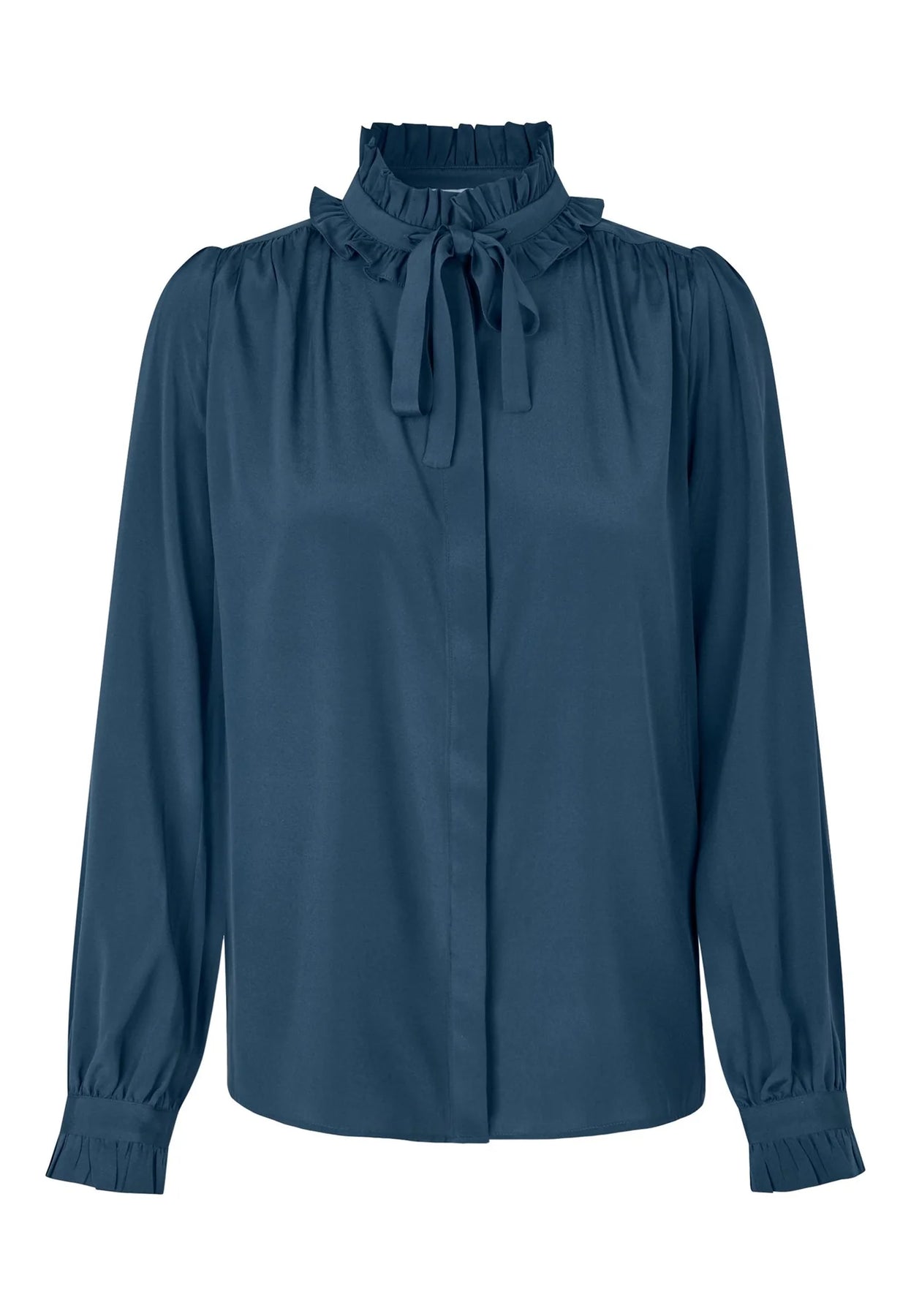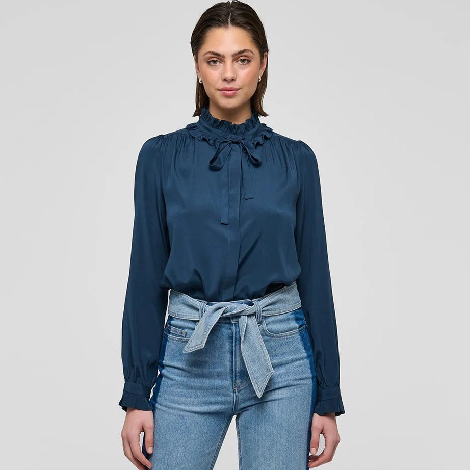 Zwei Reihen Volants, die mit einer Schleife aus Oberstoff zusammengebunden werden, bilden einen dramatischen Kragen an dieser schönen und raffinierten Bluse aus mitternachtsblauer Seide. Weite Ärmel unterstreichen die Silhouette, und zarte Rüschen bilden den Abschluss an den Manschetten.