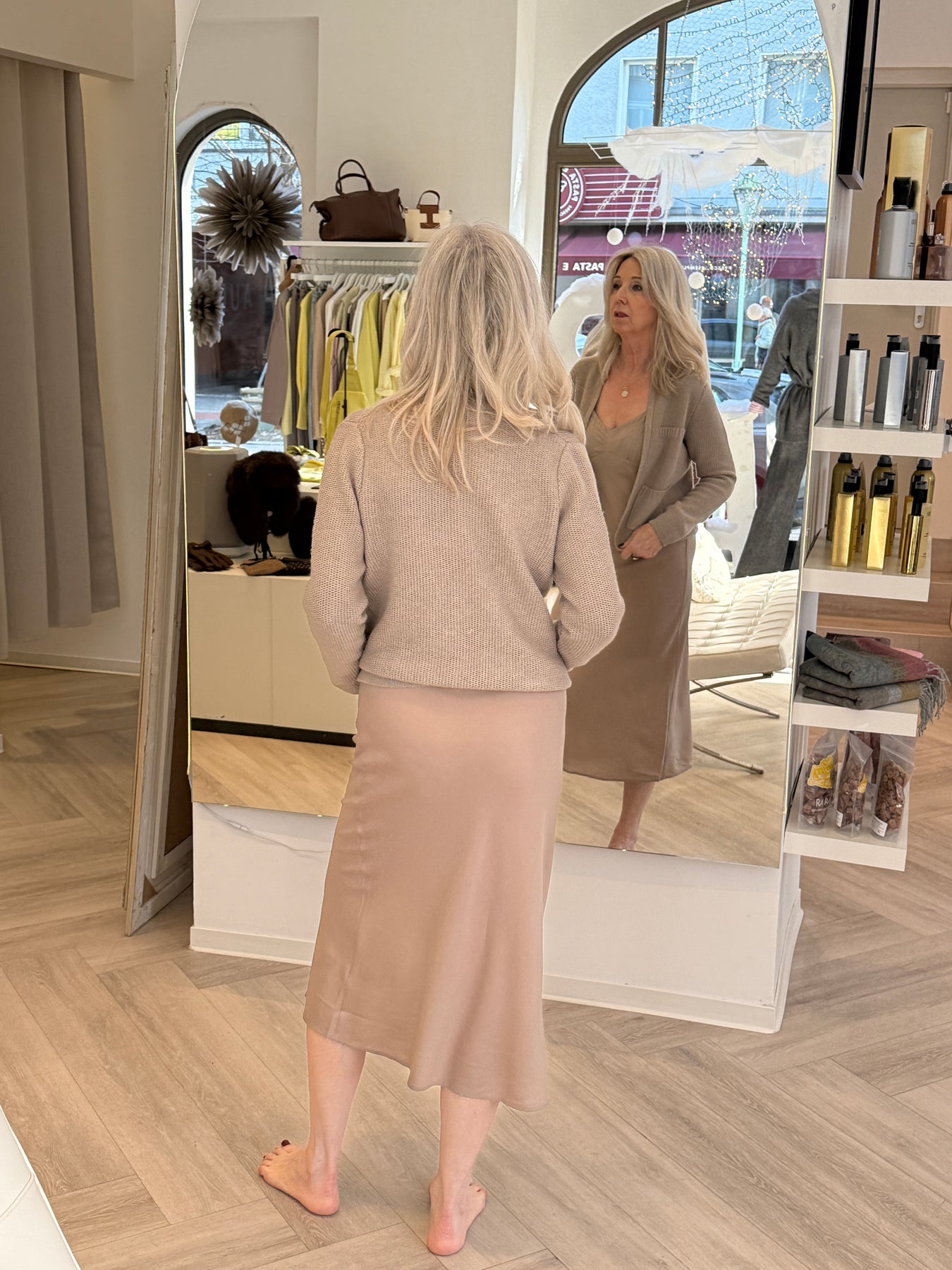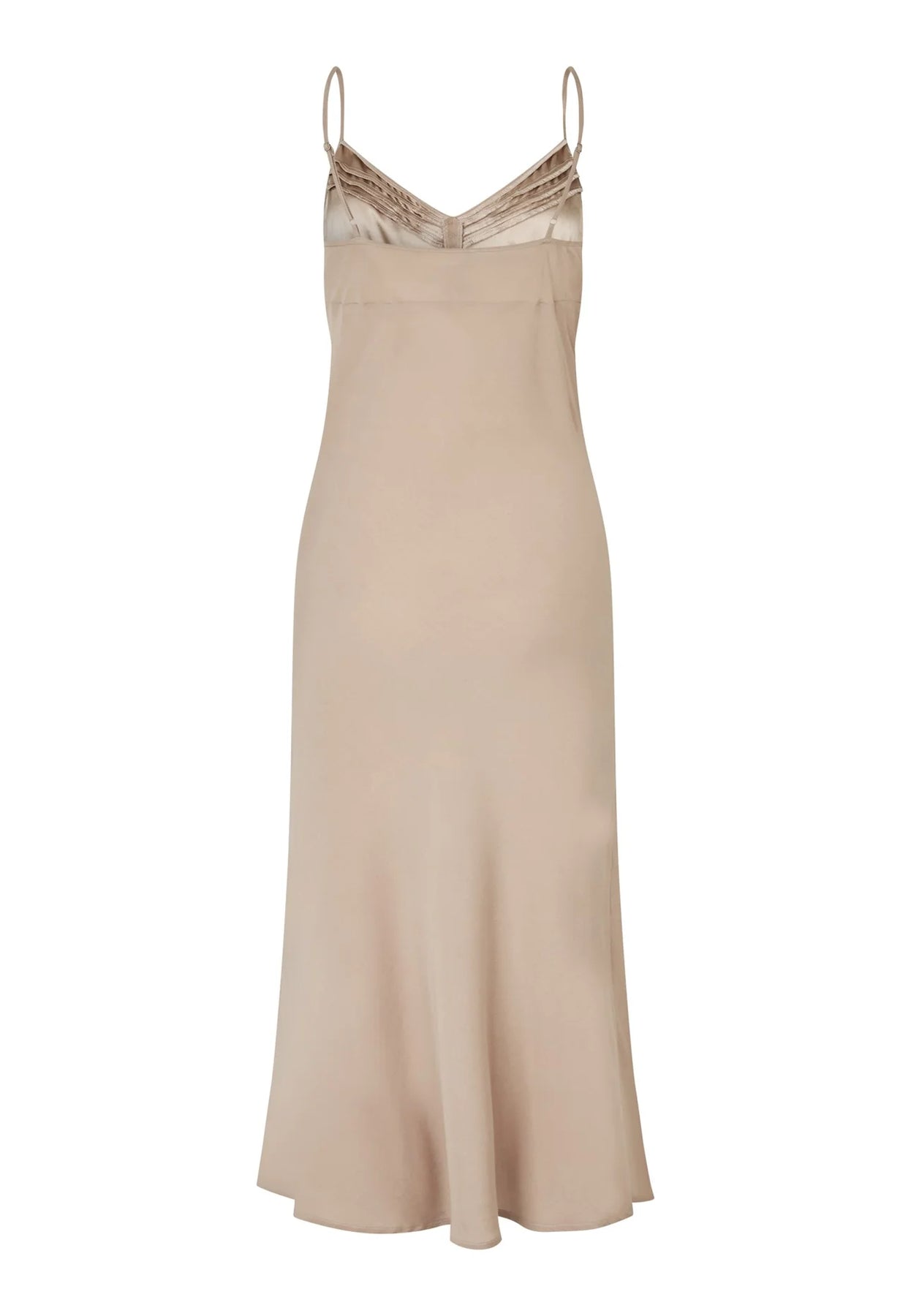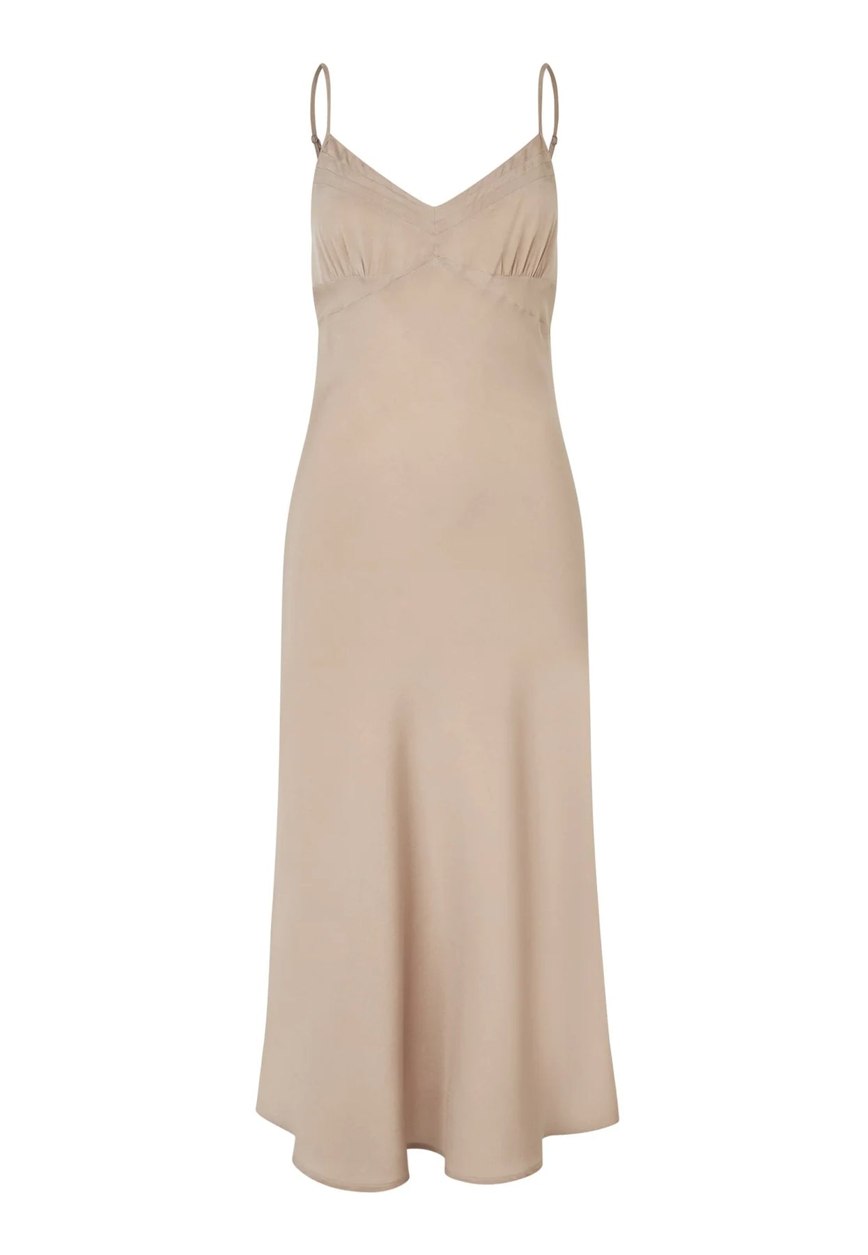 Ein Slipdress aus Seide ist eine stilvolle und sinnliche Option für den Abend – getragen unter einem Blazer oder einer weichen Strickjacke. Diese hellbeige Variante verfügt über mehrere aufwendig gearbeitete Bahnen und feine Abnäher an der Brust, die für eine perfekte Form sorgen. Es hängt an zwei verstellbaren Spaghettiträgern, und der Schrägschnitt sorgt dafür, dass es den Körper sanft umspielt und weich bis zur Wadenmitte fällt.