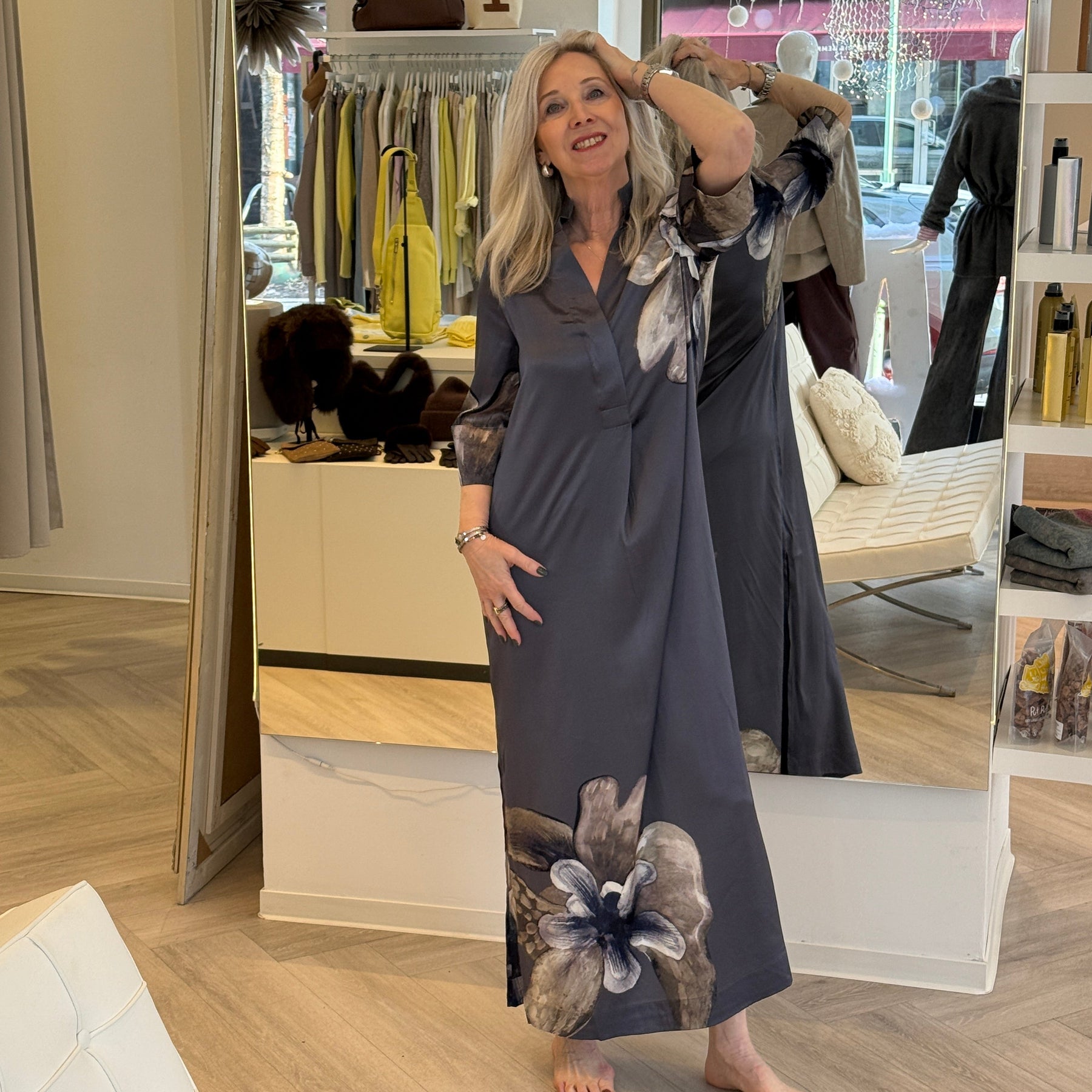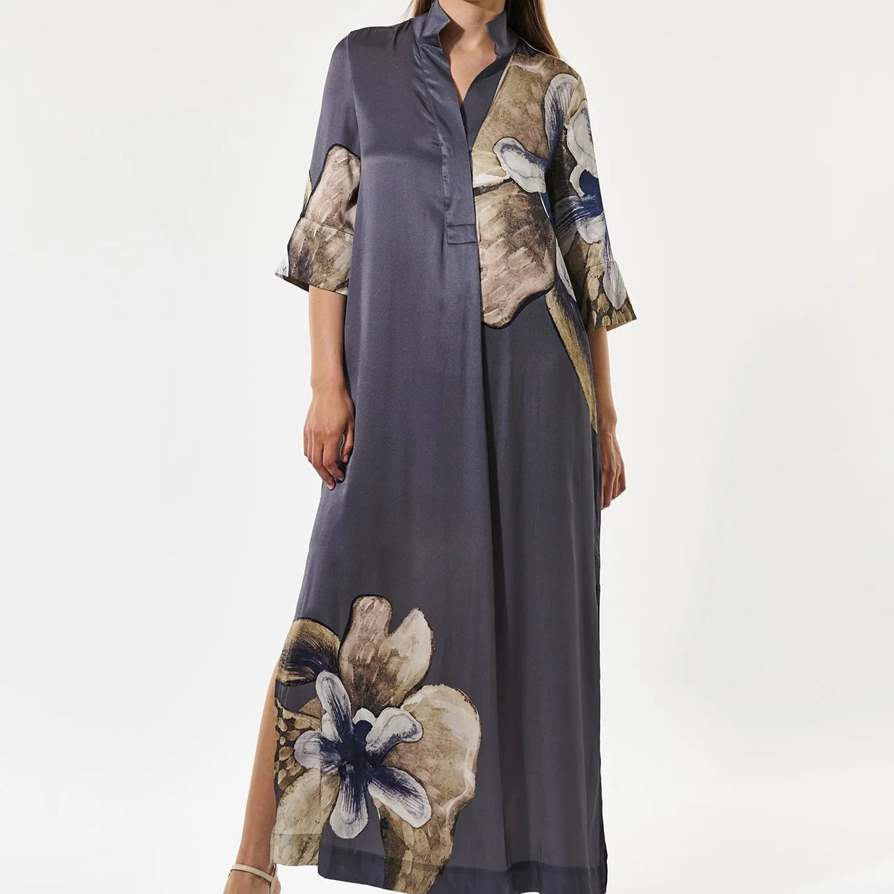 Ein vielgeliebter Dea-Kudibal-Klassiker: Helga ist ein bodenlanges Kleid in entspannter Passform mit kimonoartigem Ausschnitt, Stehkragen und weiten 3/4-Ärmeln. Diese Variante ist aus Seide gefertigt und zeigt einen dramatischen, übergroßen Blumenprint auf dunklem Grund.
