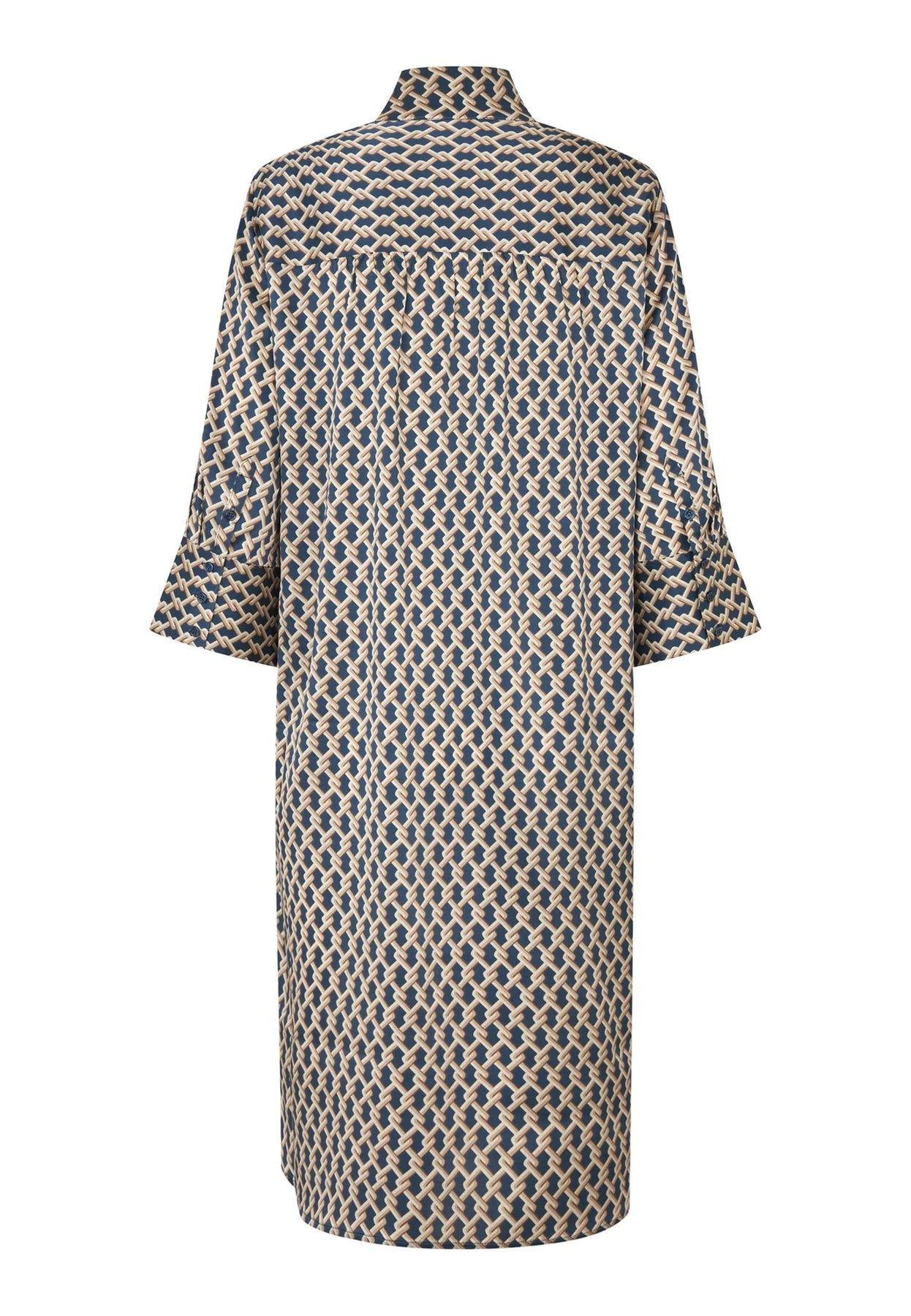 Einer der beliebtesten und langlebigsten Styles von Dea Kudibal: Dieses unkompliziert geschnittene, wadenlange Kleid passt zu jeder Figur. Der kimonoartige Ausschnitt und der Kragen verleihen ihm Eleganz, während die tiefen Ärmel mit stoffbezogenen Knöpfen eine lässige Note haben. Diese raffinierte Version ist aus Seide gefertigt und zeigt ein klassisches grafisches Design aus ineinander verschlungenen Formen.